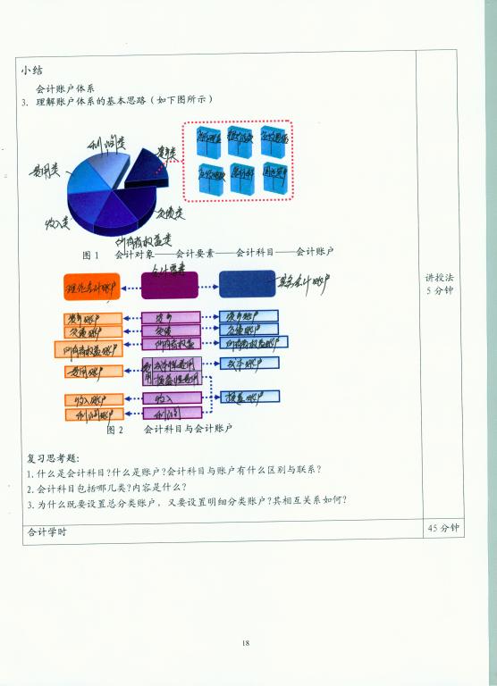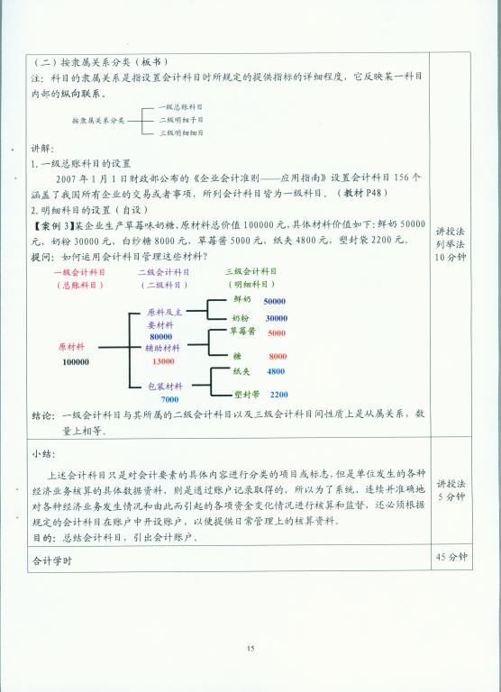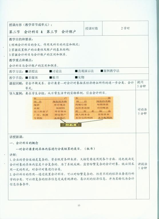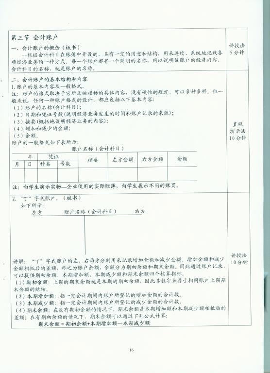 该教案的书写规范、合理。反映了全面的课程信息,教学目标的表述明确、具体、简明,教学内容及重点难点表述清楚,教学过程的设计详实、简明,具体设计了导入内容、案例、实物、讨论等教学方法,板书、图标等表现形式,总结、作业等教学环节。板书内容的设计具体,便于操作。