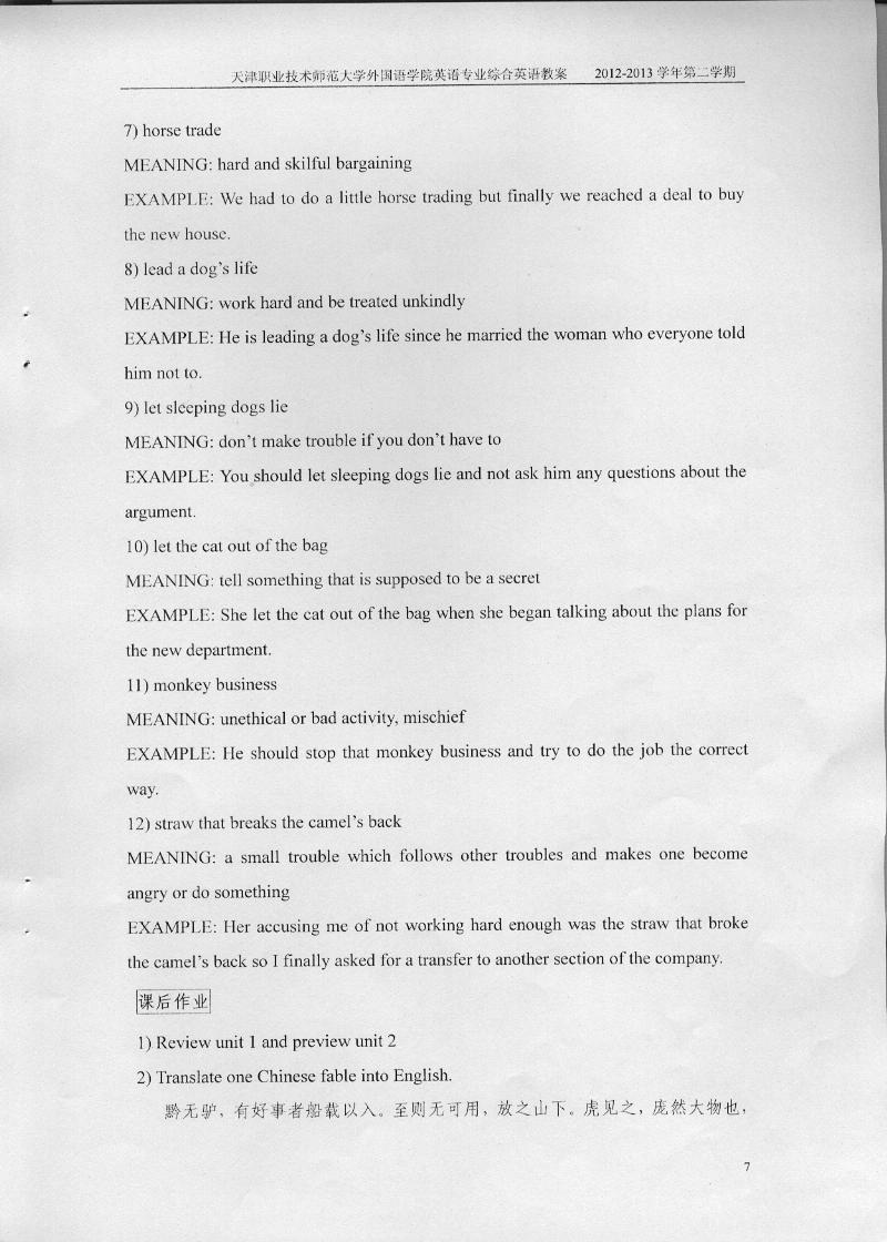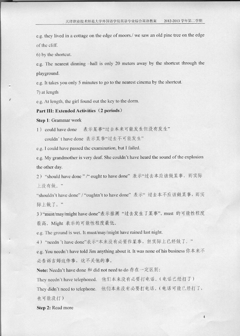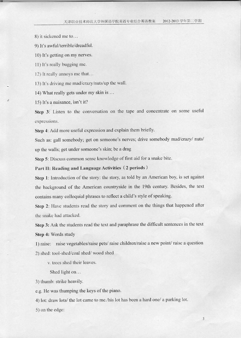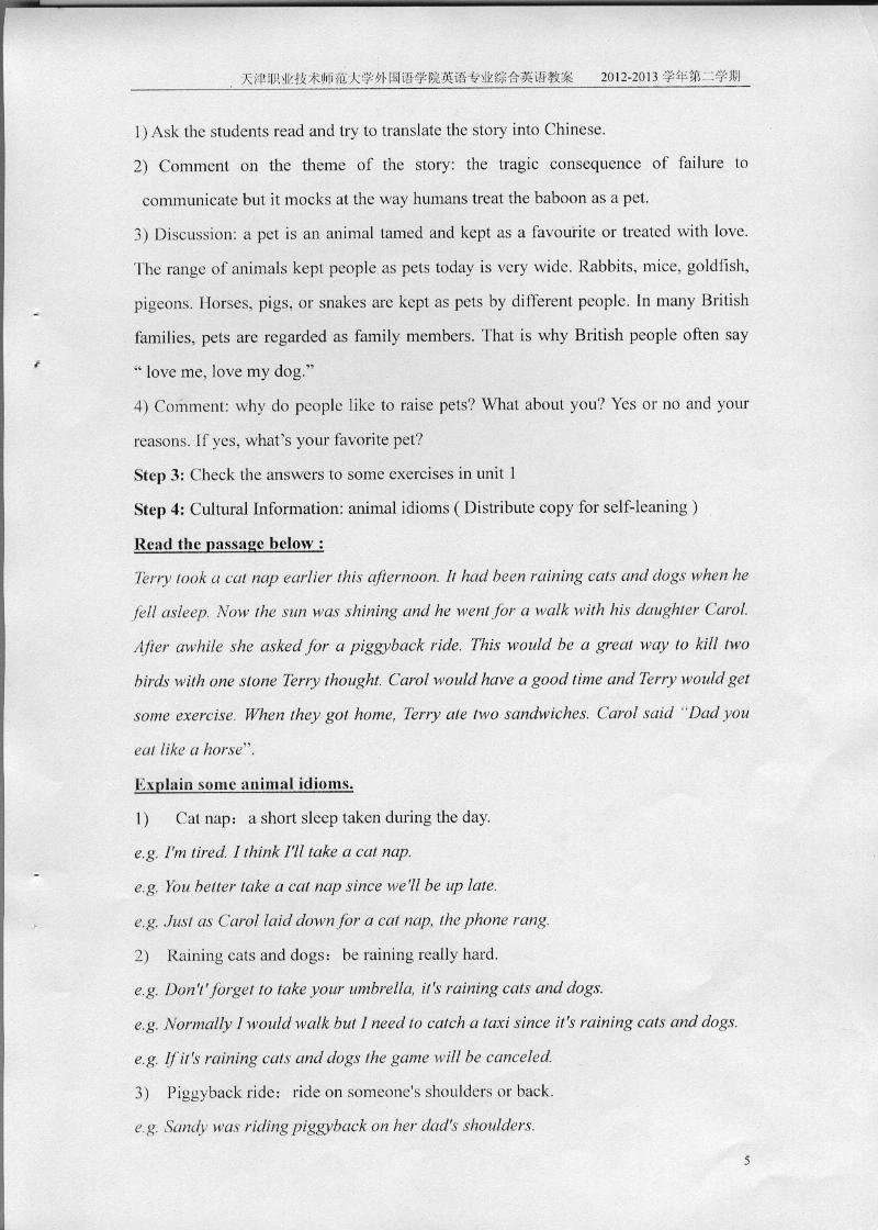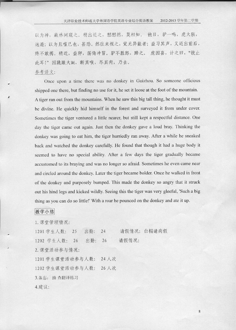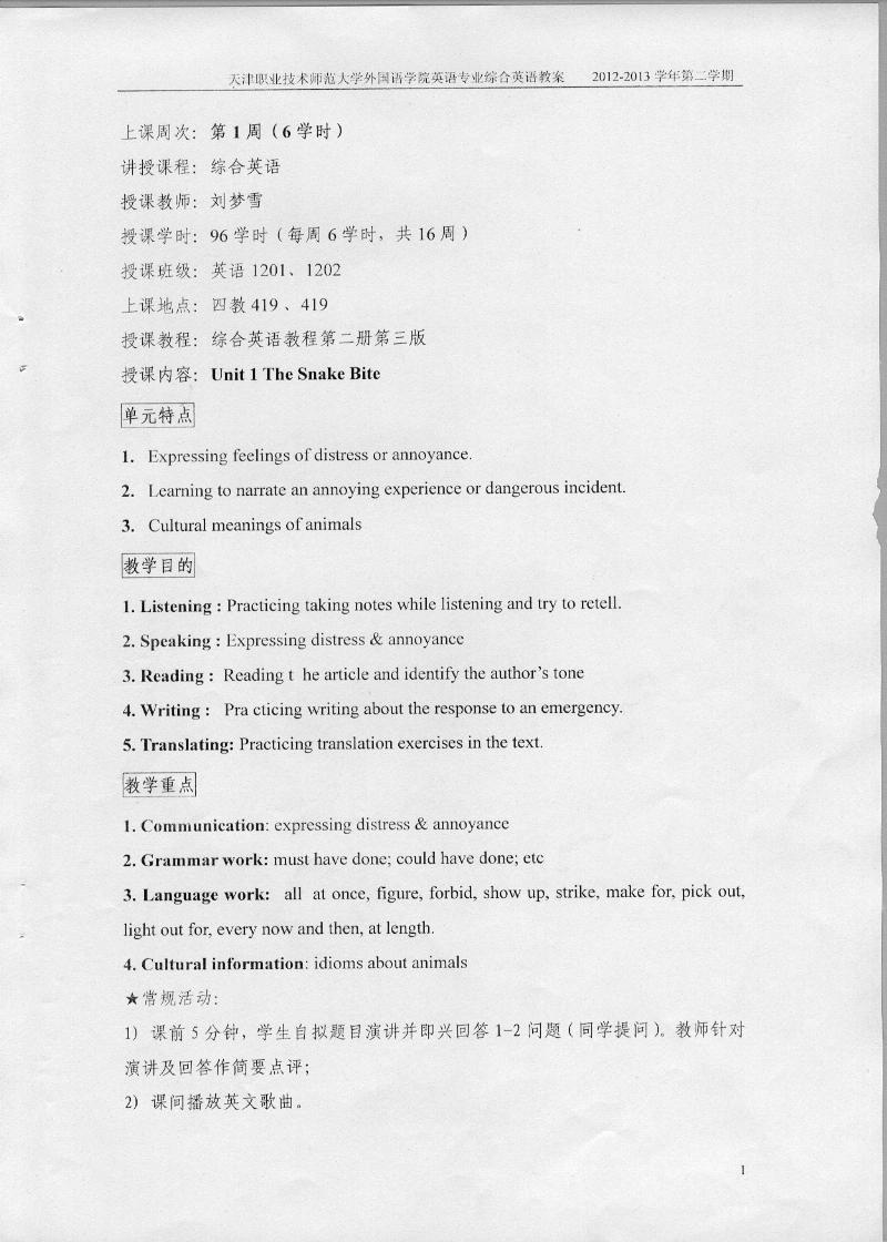 课程信息完整,教学目标明确,授课对象、单元特点及教学重点交代清楚,学生课前3分钟常规演讲热身,相关话题及图片描述开场、导入新课,教学过程、步骤及教学活动设计具体详实,环环相扣,教学方法多样,通过问答、听录音、朗读、复述、翻译、讨论、重点词语及语法操练、文化对比分析等方式深入师生互动,教学环节完整,教案公正规范附插图,附有课堂学生出勤情况和学生课堂活动参与人数。
