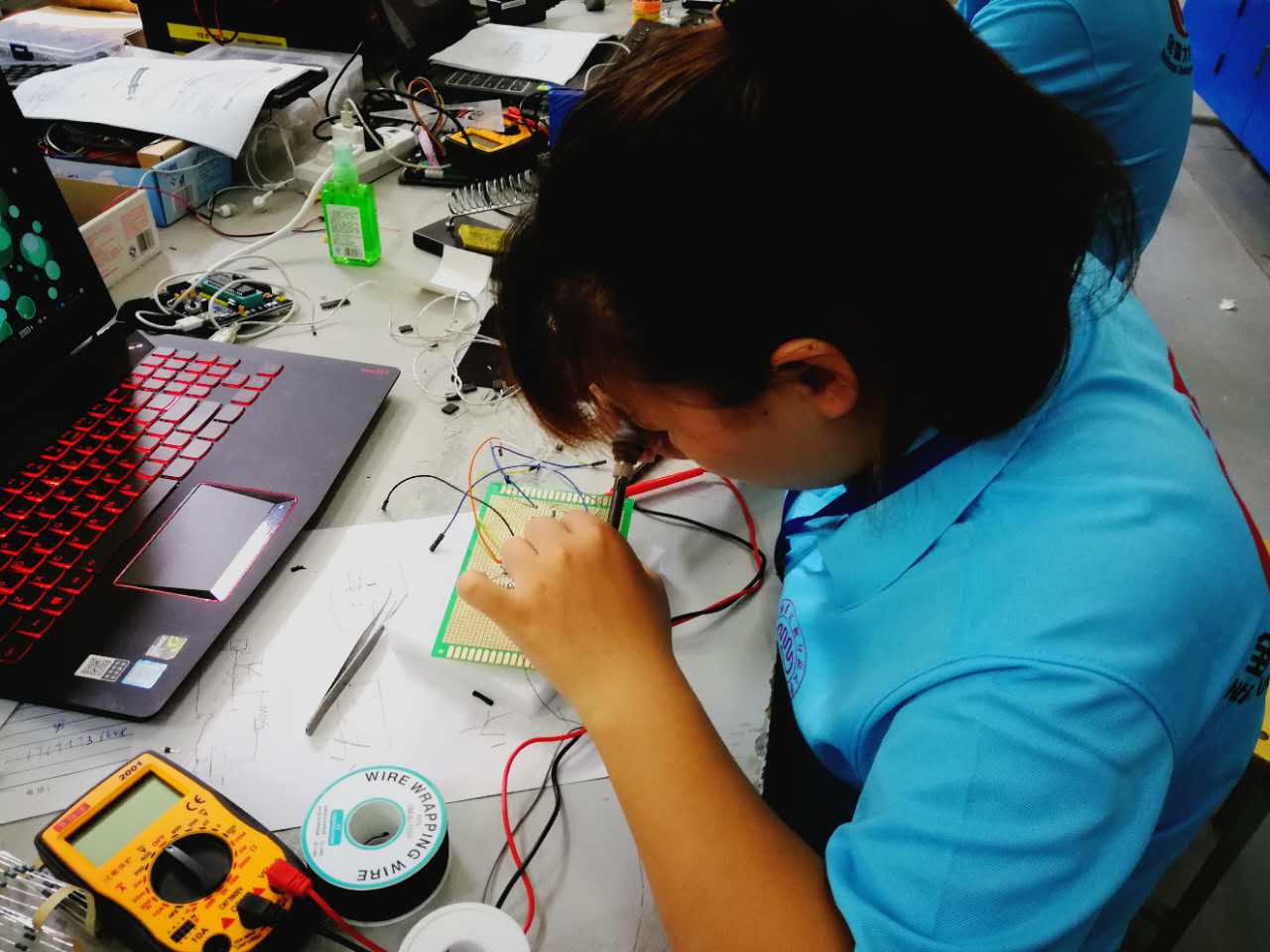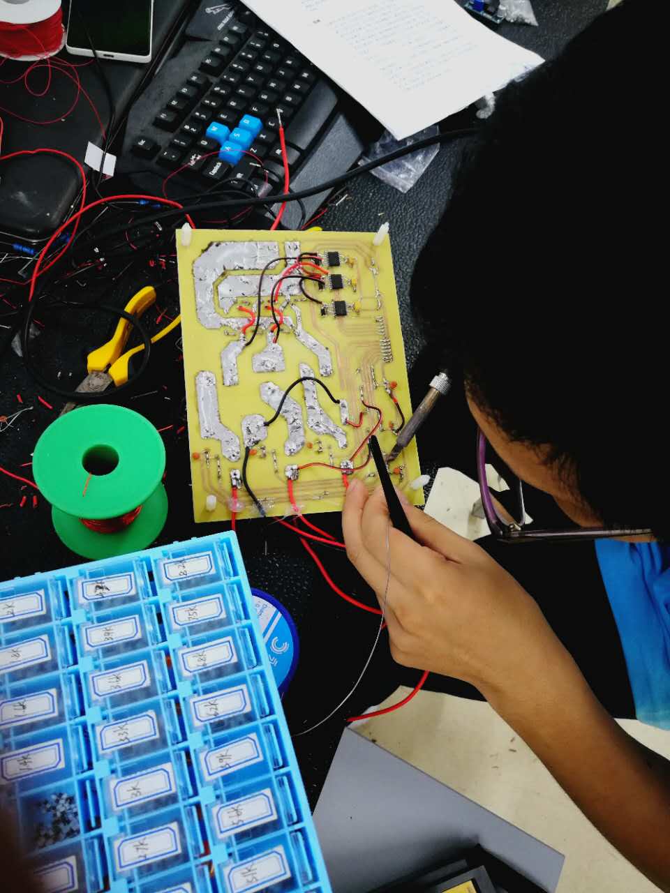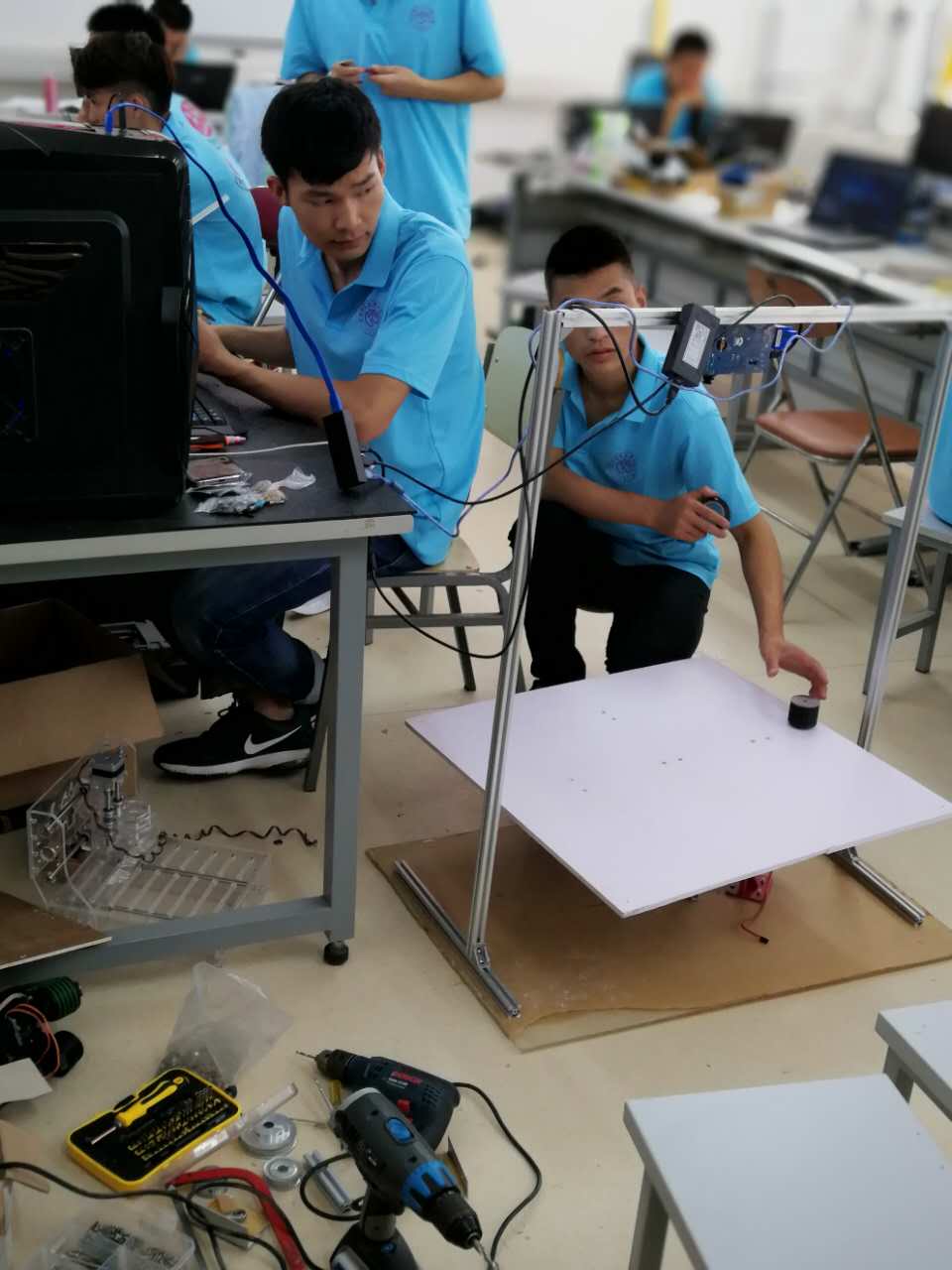 比赛中,各参赛队全体队员统一着装、佩带标志,严格按照大赛的要求,迅速选题,正确设计方案,明确分工,在设计与制作中耐心细致。由于时间紧迫,题目难度大,指标要求高,参赛同学吃喝都在实验室,基本上每天只休息四~五个小时,甚至通宵苦战。经过四天三夜的艰苦奋战,62支参赛队全部在规定时间内按要求完成作品设计,顺利上交。